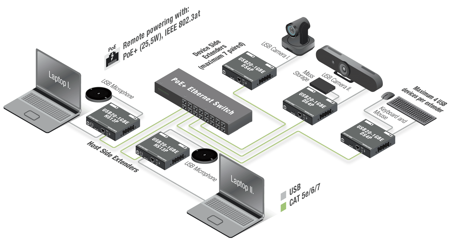 This product focuses solely on USB 2.0 mextension and therefore it is a cost-effective product in its category. As compared to the previous USB20-1GBE-HS10 and DS4 extenders, now the host and the device side extenders can also remotely be poweredm using PoE+. In addition, the host side extender provides 3 USB-A ports for local device interfacing.