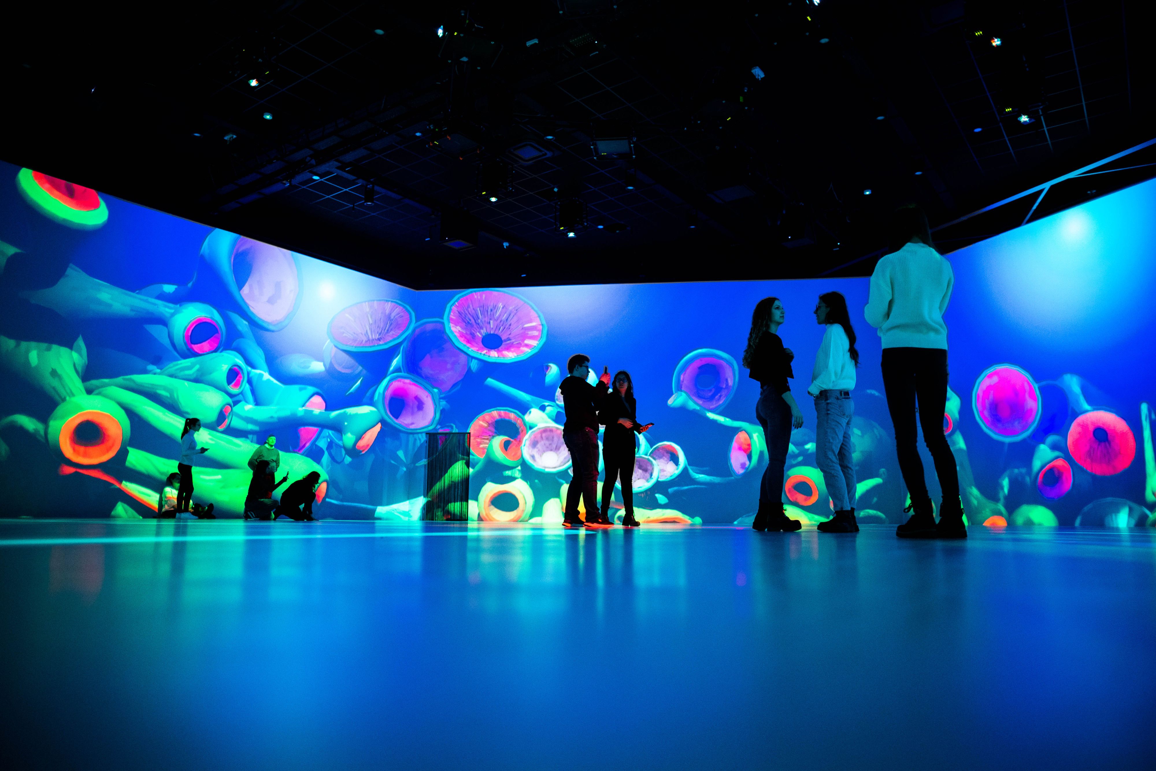 For the main room, we have 14 Panasonic 4k projectors working with an interactive system, which allows users to interact directly with the content being displayed. Running around this main space is the foyer, an area where digital artists might gather to experiment directly with the content playing in the main room in real-time.